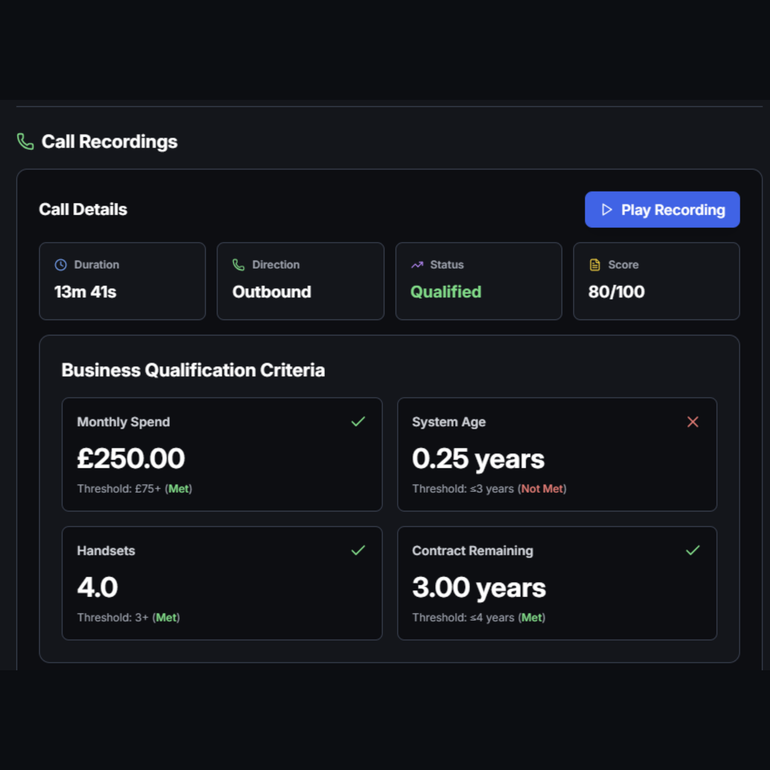 Sync structured insights directly into Fibre CRM and downstream workflows.